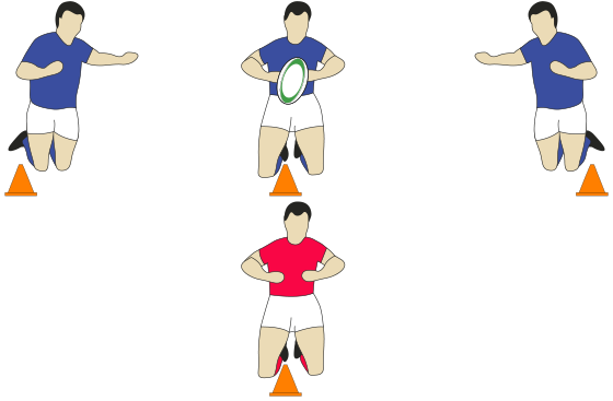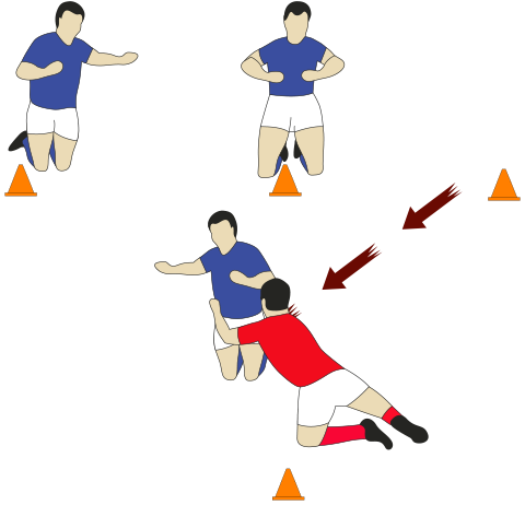 Tackler stands facing two attackers. Have two players holding ball behind their backs and the tackler facing them 1m away, positioned in the middle. All are on their knees.