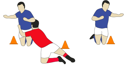 - The defender has their eyes open and is sighting the target. They drive in with the head to the side and shoulder making a strong contact via a straight back, thrust the arms forward around the attacker and squeeze their arms together by grabbing their own wrist. Bounce up and get ready for the next tackle.