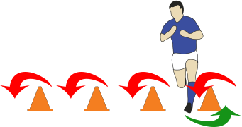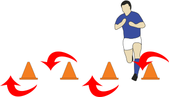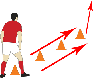 - Player faces side onto line of 4 cones.