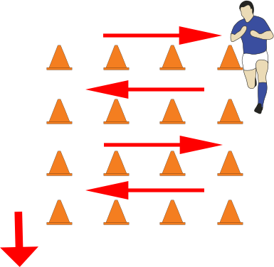 Player starts side on to line of cones and on “go”, runs forward through first gap, backwards through next gap, forwards, backwards around last cone – then comes back doing the same.