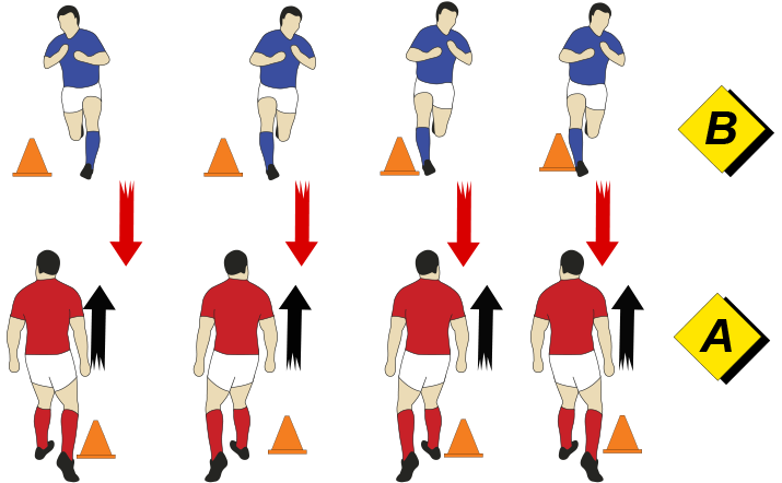 Tacklers (B) stand in a line facing ball-carriers (A) one metre from the cone.