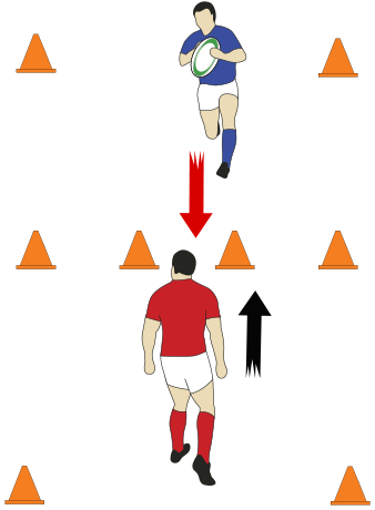 - The Tackler moves forward in a crouch using the small, quick steps and takes a larger step close to the ball-carrier with lead foot. As they do this the head moves to the correct side which would take it to the backside of the attacker if a full tackle was to be made. The defender then touches them with two hands on the waist and pushes them back.
