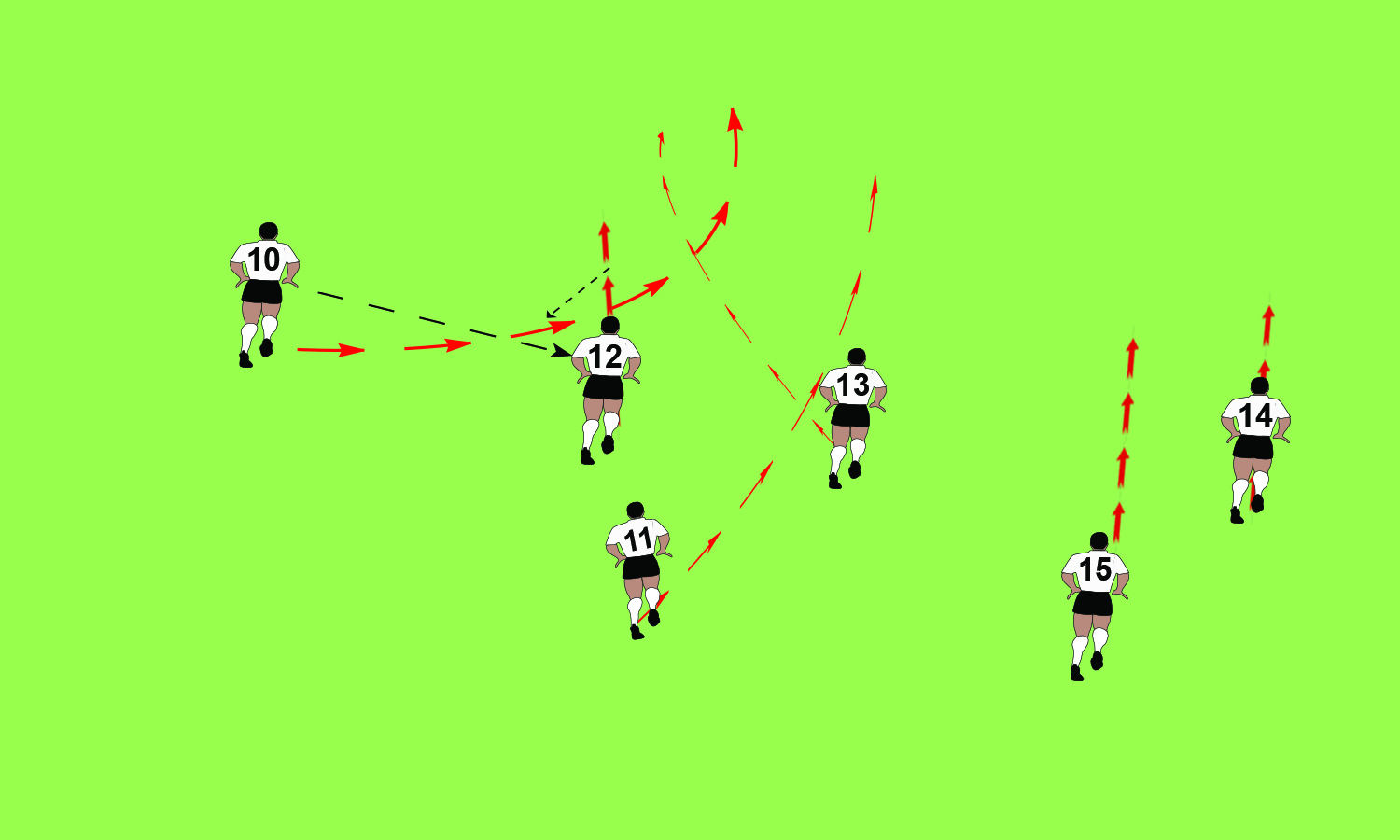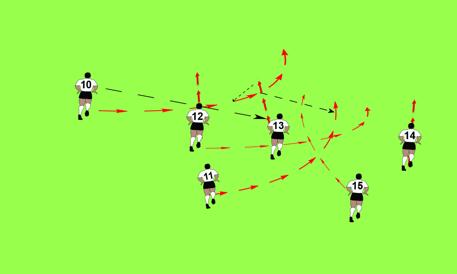 *Variations: The variations are best out wide with the flat and wide formation inside. As an example: 10 cuts 12 and passes flat to 13 / 12 is already looping and running wide off 13 / 10 wraps hard after their pass so they can be a decoy outside 13 / 12 calls for the ball which is passed across 10 to the blindside winger / the winger has 12, 15 and the openside winger in support / 10 can get in the pocket just behind or inside the ball carrier / you may wish to make a plan for these three players as well.