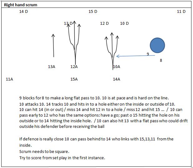 This is just a starting point with limitless opportunities which you need to adapt to as you discover what works best. Initially you are threatening the defensive line by the whole backline standing close and running at pace directly towards the tacklers. It is decision time for the defence. If you can make better decisions than they do you will be in behind them. Then it is just a matter of which player receives the pop pass/early pass/makes the quick clean out, and you are away! If you have high quality passers you might start further apart; or you may start close together initially and a player can receive a pass after he has drifted hard and hit an outside shoulder. Think of some more ideas. Change your players to suit the role. If the scrum is on the left side of the field you have even more opportunities open to your thinking!