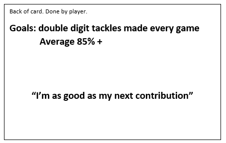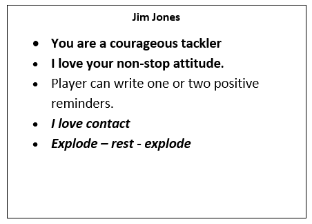 The reason the player has this card is so that it can be carried around in their rugby bag and referred to as necessary. Reading before a game. Using it to help with imagery and creating a ‘feel good’ factor. It will offer a positive fall-back scenario when the going gets tough.