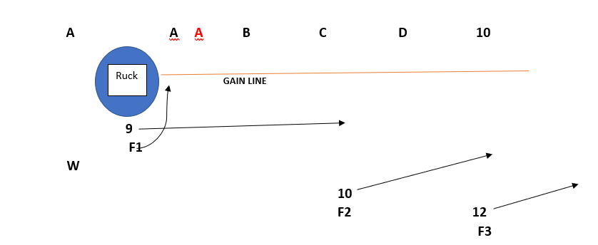 If 9 passes to his outside then Forward 1 has an important support role and needs to be the first inside support at the ruck or to take a pass.
