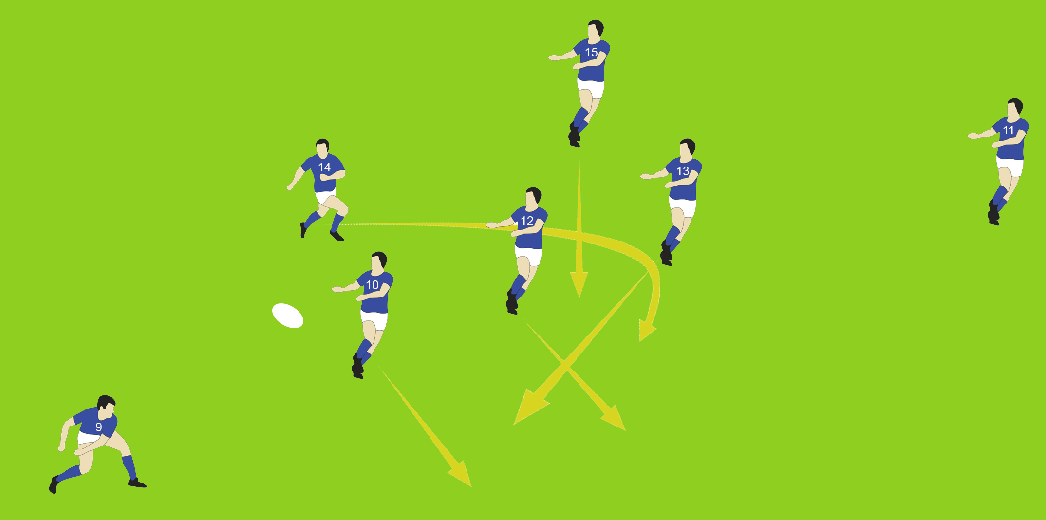 Scud 1: 9 passes to 10 / 10 & 12 run at 45 degrees / 13 runs a dummy switch off 10 / 10 passes to 15 who runs between 10 & 12 / 15 will be the player preparing for the bump off. / 11 or 14 is in the pocket behind 15