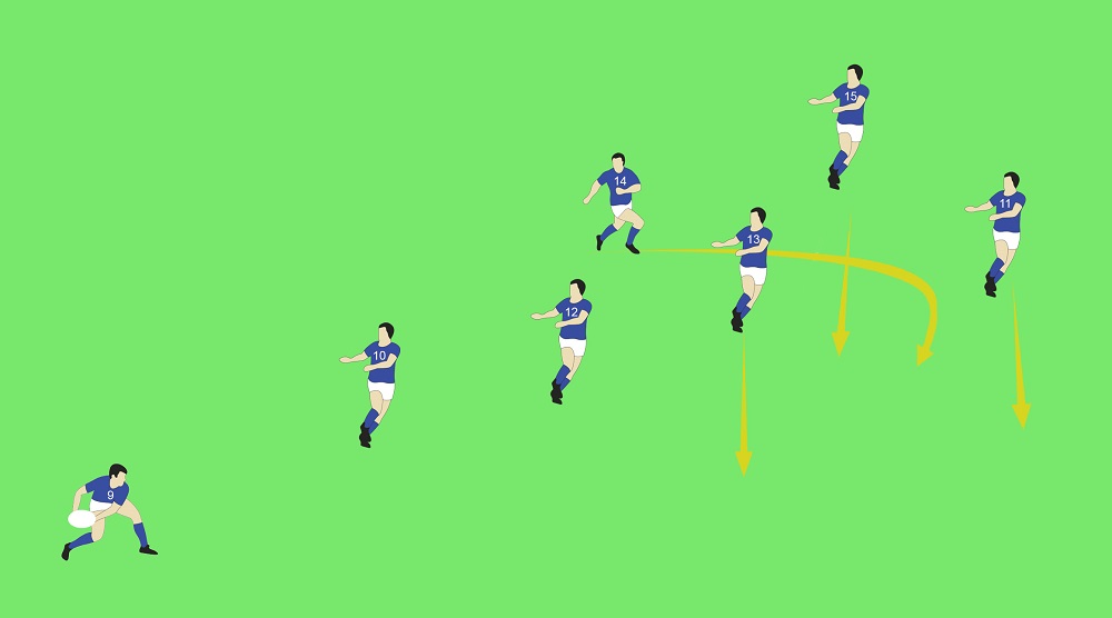 This should only be used if the defence is tight on the ball carrier and they have scanned to see that there is greater space out wide. In a set play it may come from 10 hitting 13 or 15 or even the wing, dependent upon the defensive structure.