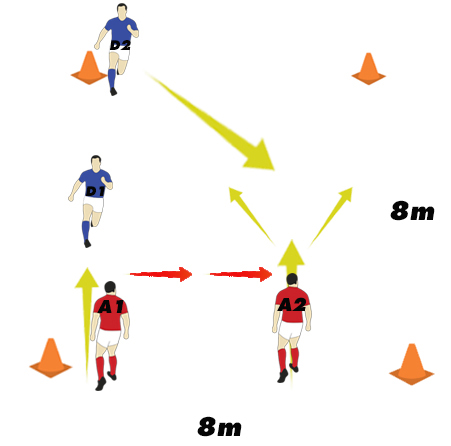 Mark out a larger grid. 8 x 8 metres. 2 attackers are along one side of the grid. 1 defender is opposing the ball carrier 4 metres away and another defender is behind the original defender on the corner of the grid opposing the ball carrier.