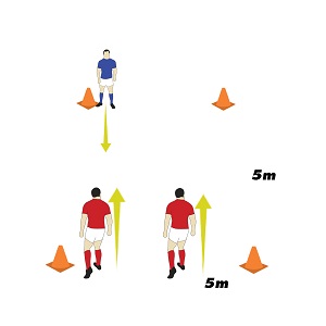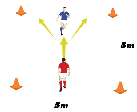 b) When the players understand the concept start them 5 metres apart and ask the attacker how many tries they can score by using the side-step. Try 5 turns each.