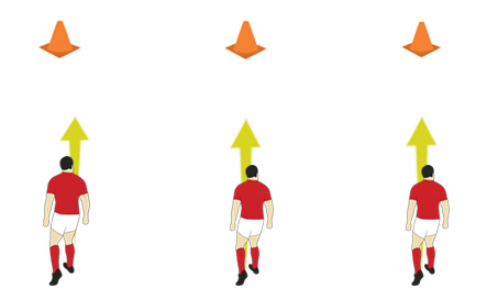 They will then step back in the other direction off the foot which they had just planted. Take a wide step back to where you started and accelerate forward. This requires the player to step laterally before going forward. It is that stop-start movement that is the key to beating the tackler.