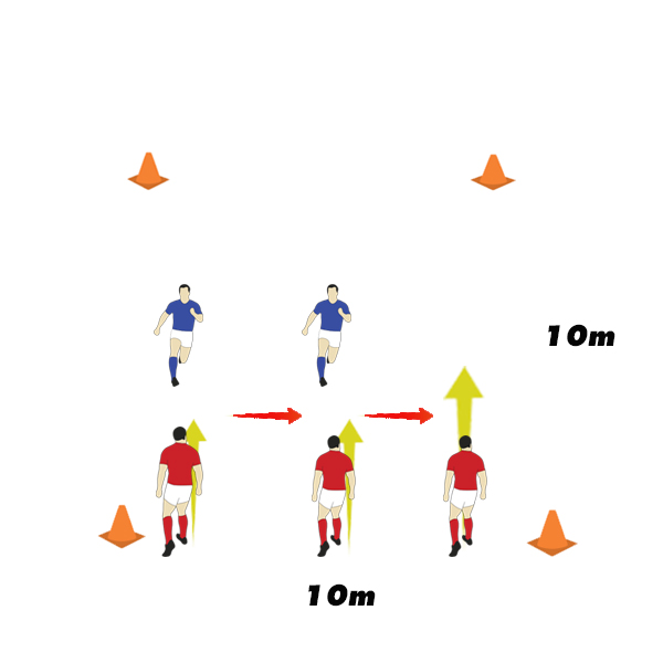 The ball carrier and defender move forward towards each other and at the appropriate time the ball carrier will pass to his support player. The pass must be timed so that the defender does not have time to run over and tackle the support player. This requires the ball carrier to commit the tackler by running straight at them and keeping them square and the support player timing their run so that they accelerate and catch the pass running at nearly full speed.