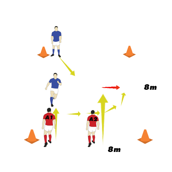The attackers must pass and support so that one is on the outside of the ball carrier and one is behind them.