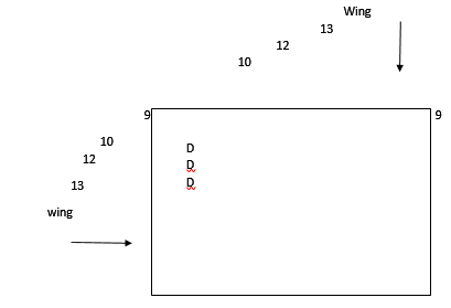 As soon as they reach the line the defence will reform and defend against the next attack who are running across the grid in another direction. The attack will attempt to score. 9 will run to the opposite corner to start the attack. (There are 2 9’s as per the diagram)