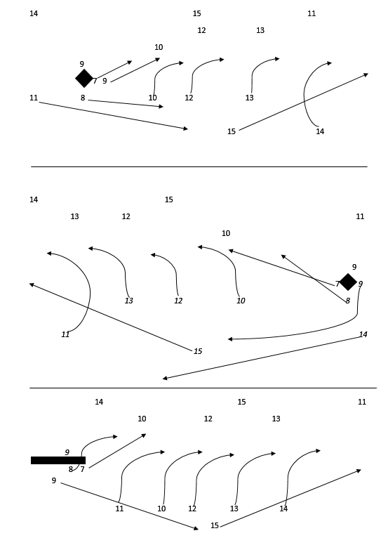 At scrum time (in these diagrams – your plan may be different) if 15 enters as an extra player outside 12 they will be tackled by 12.