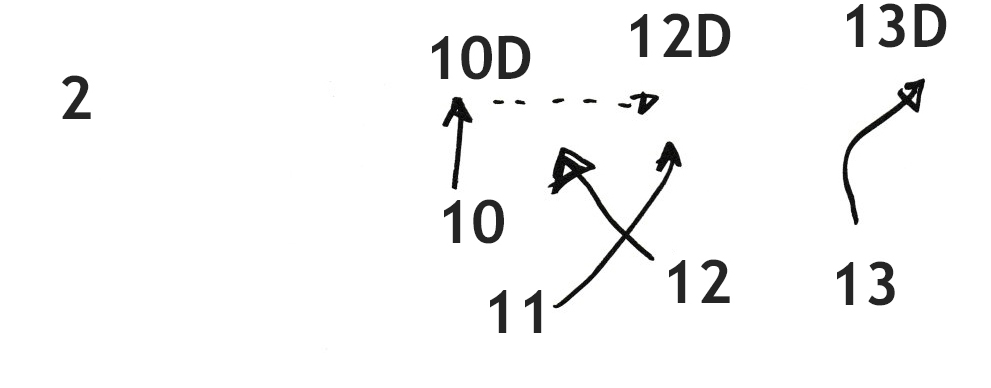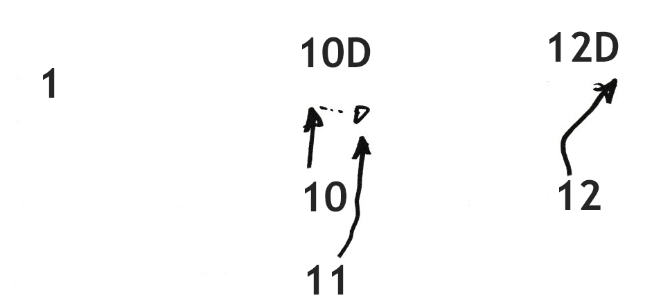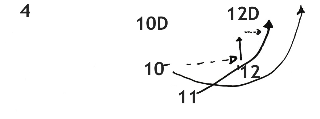 10 can pass to 12 or pass behind 12 to 11 who straightens up, accelerates, and forces the gap between 12D and 13D.