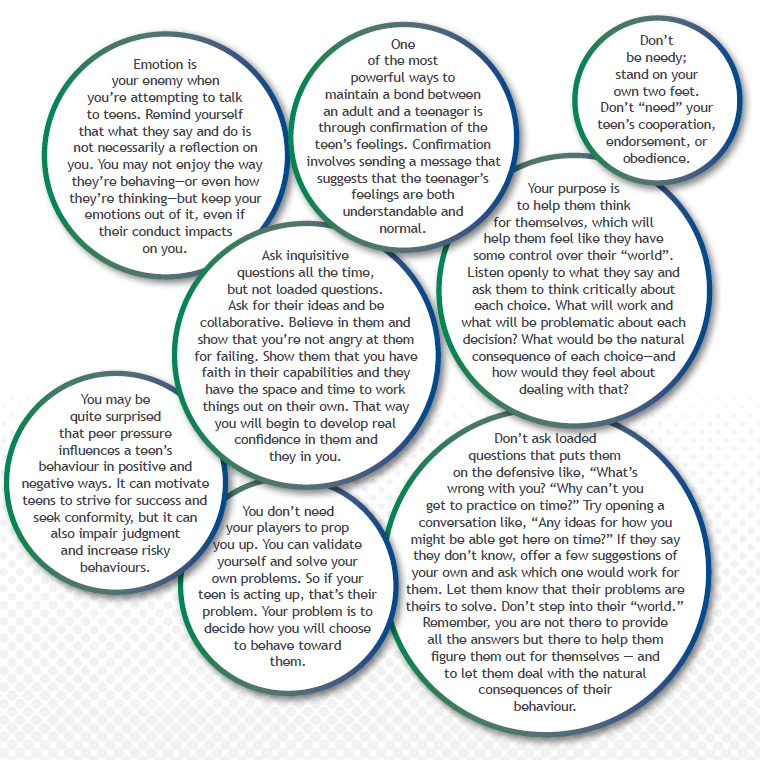 It is common for coaches to feel as though they cannot understand teenagers and teens themselves often feel as if nobody understands them. Learning to communicate effectively produces openings for understanding, as well as options for positively influencing teens. As a means of promoting effective communication, the following guidelines are listed here: