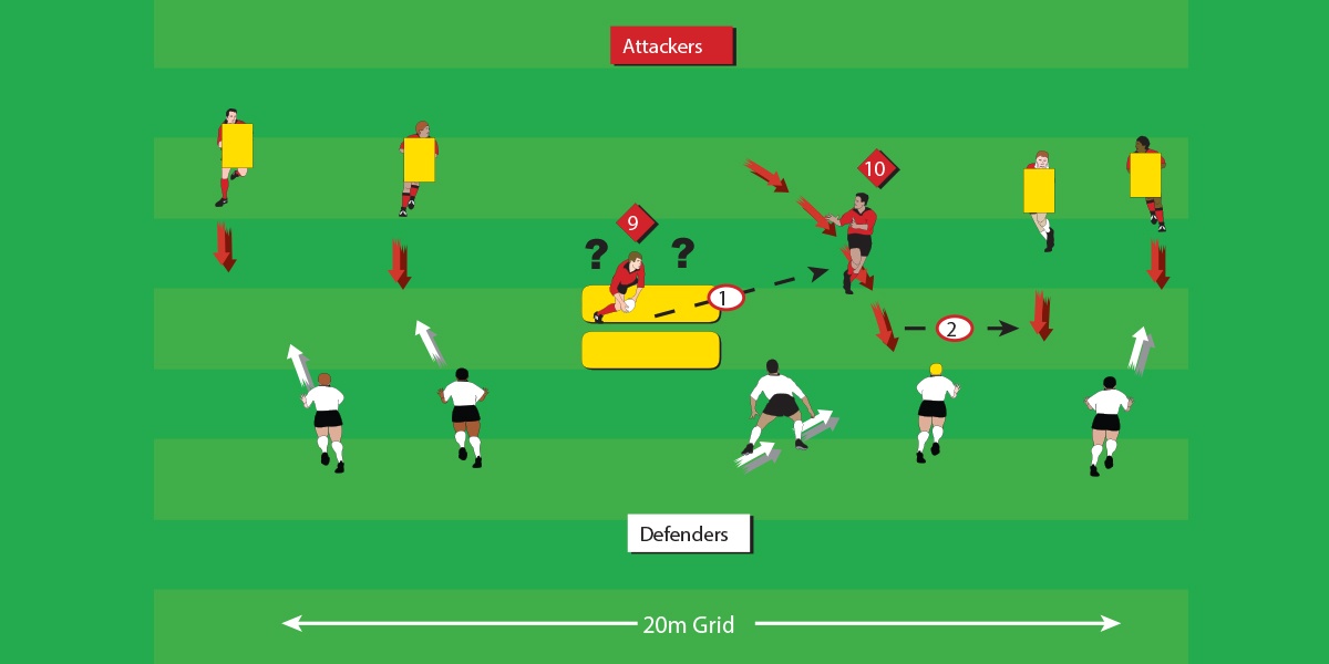 - Halfback and first five-eight in attack; team in tackle suits; rest of attackers carrying hit shields.