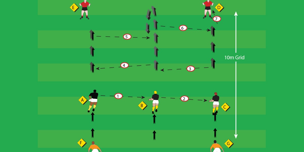 - Once across the grid E passes to F, B links the passes from F to G as these players F, B and G run back across the grid.