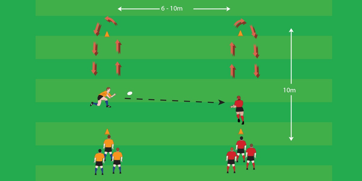 - First player from that group advances to the ball and passes the ball away in one action to the first player advancing from the second group who has sufficient depth to enable them to place the ball back on the line on the run.