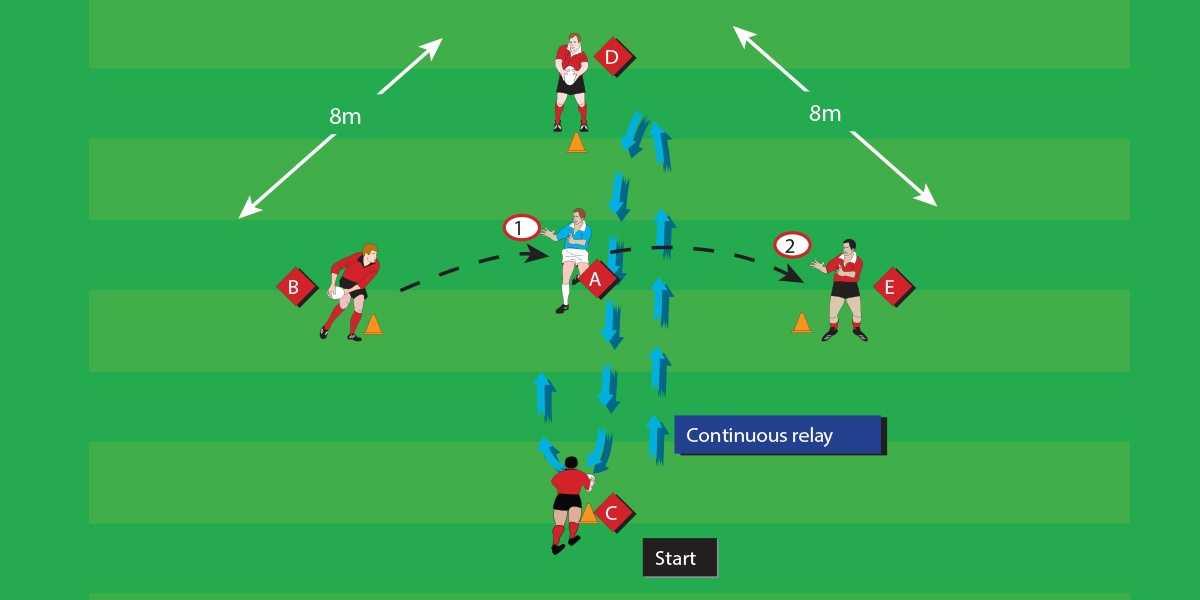 - When A is a couple of meters from C, C passes to A who immediately returns the ball, turns and runs back towards D, catch/passing from E to B.