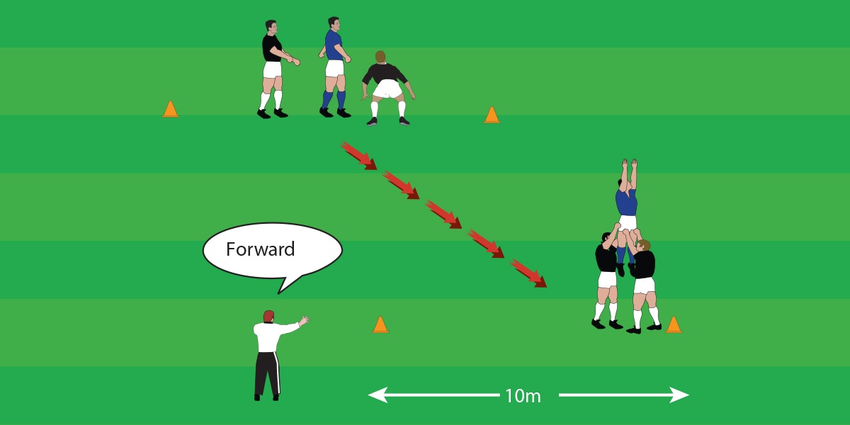 2. On coach's command of "forward" or "back" the jumper moves approximately three small fast steps into a position to explode upwards.