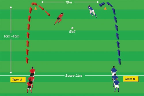 Two lines of players form, each line facing a cone which is positioned 10–15 metres from the lines and 10m apart. A ball is placed between the two cones.