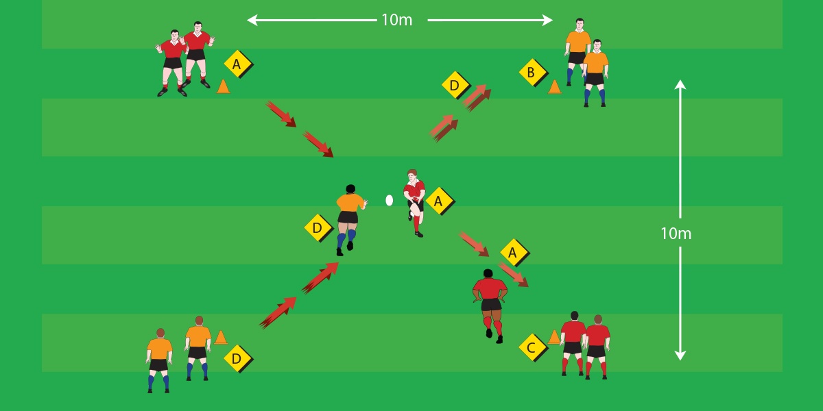 - The new ball-carrier then passes to their right to the first player from group C etc.