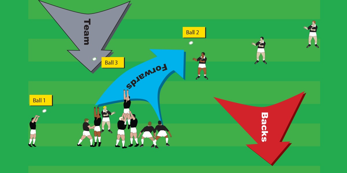 - The first ball is fed from the set piece for the use of the backs, who complete a pre-planned move. During the time that the backs are completing their move, the second ball is used for the forwards to complete a pre-planned move. The third ball is used for the team to operate as a unit, after both forwards and backs have moved back into position.